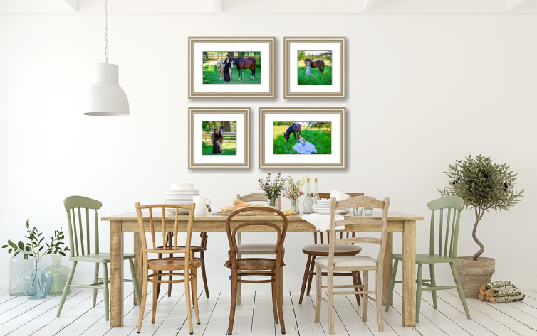 We'll schedule a Zoom meeting approximately 2 weeks after your equine portrait session. During this virtual meeting, I'll present a slideshow featuring all of your images. Together, we'll select your favorites and discuss any specific preferences you have. Then, I'll create mock-ups of different layout options using images of your own walls, allowing you to visualize exactly how your portraits will look in your home.